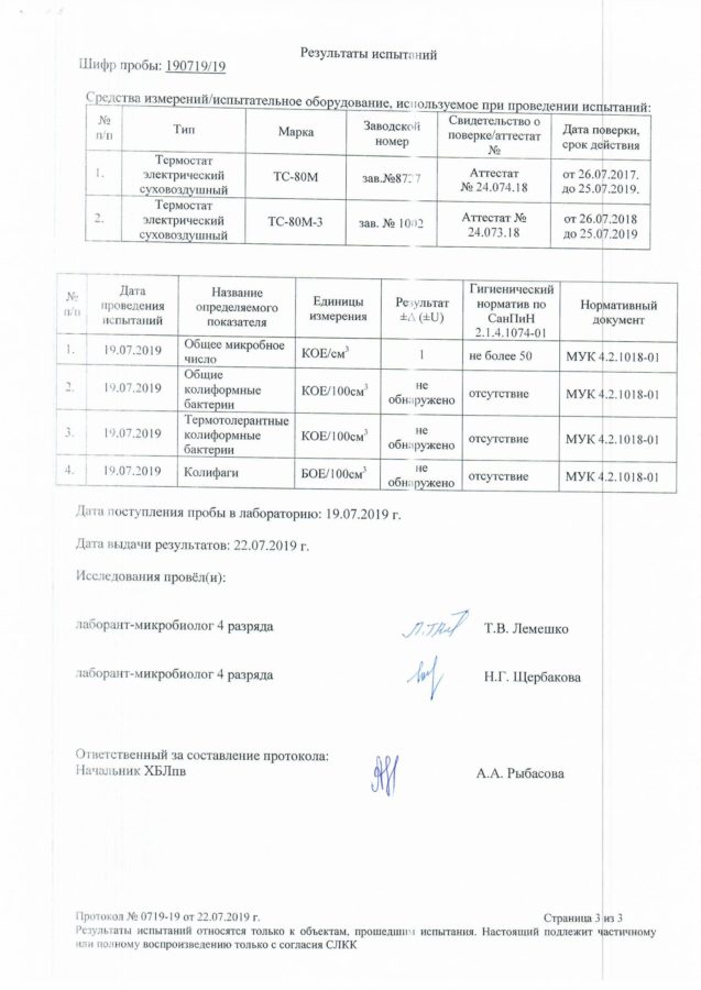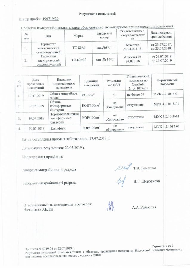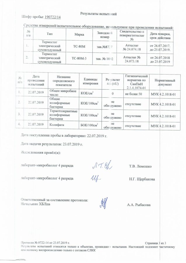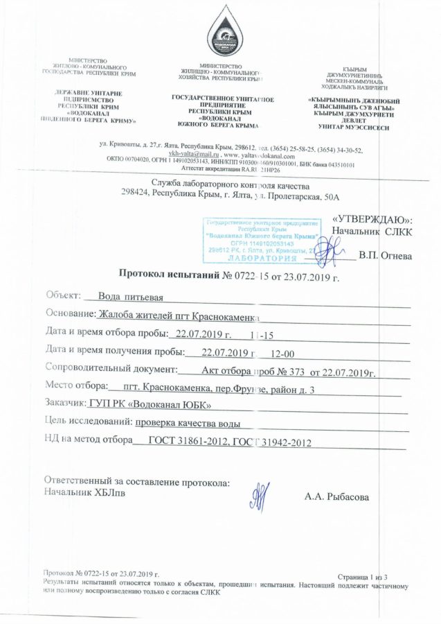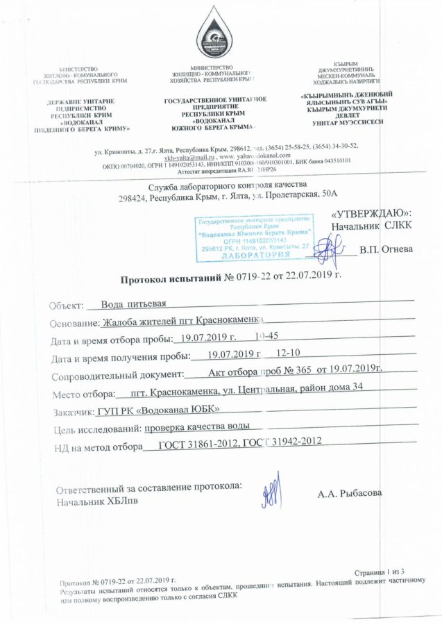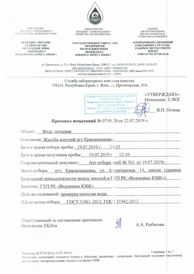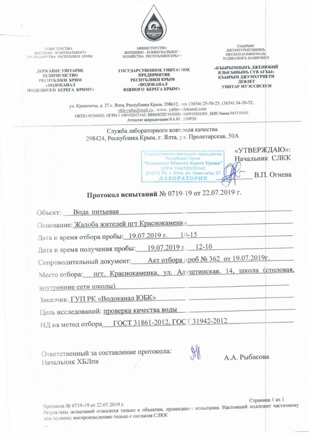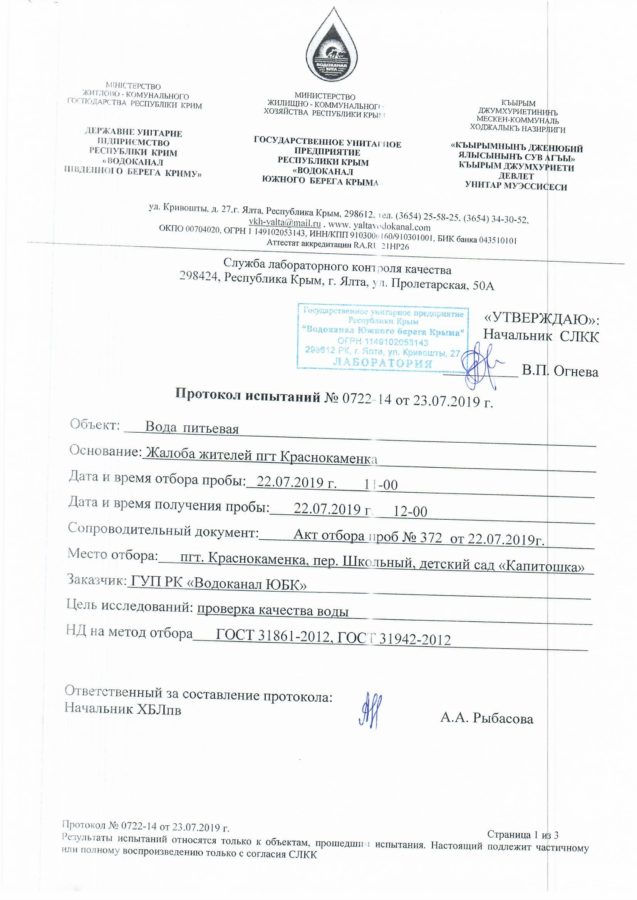 На основании результатов лабораторных исследований данных проб воды ГУП РК «Водоканал ЮБК» сообщает, что вода во всех точках отбора соответствует требованиям СанПиН 2.1.4.1074-01 «Питьевая вода. Гигиенические требования к качеству воды централизованных систем питьевого водоснабжения. Контроль качества.».
