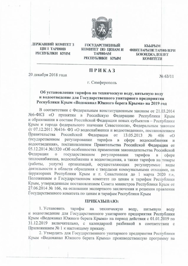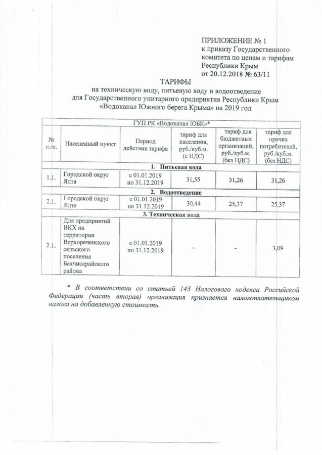 По вопросу экономической обоснованности тарифов, Государственное унитарное предприятие Республики Крым «Водоканал Южного берега Крыма» информирует о том, что на 2019 год установлены тарифы на питьевую воду и водоотведение для населенных пунктов на территории городского округа Ялта, относящихся к ГУП РК «Водоканал ЮБК» в соответствии с Приказом Государственного Комитета по ценам и тарифам Республики Крым от 20 декабря 2018 года № 63/11 в следующих размерах: