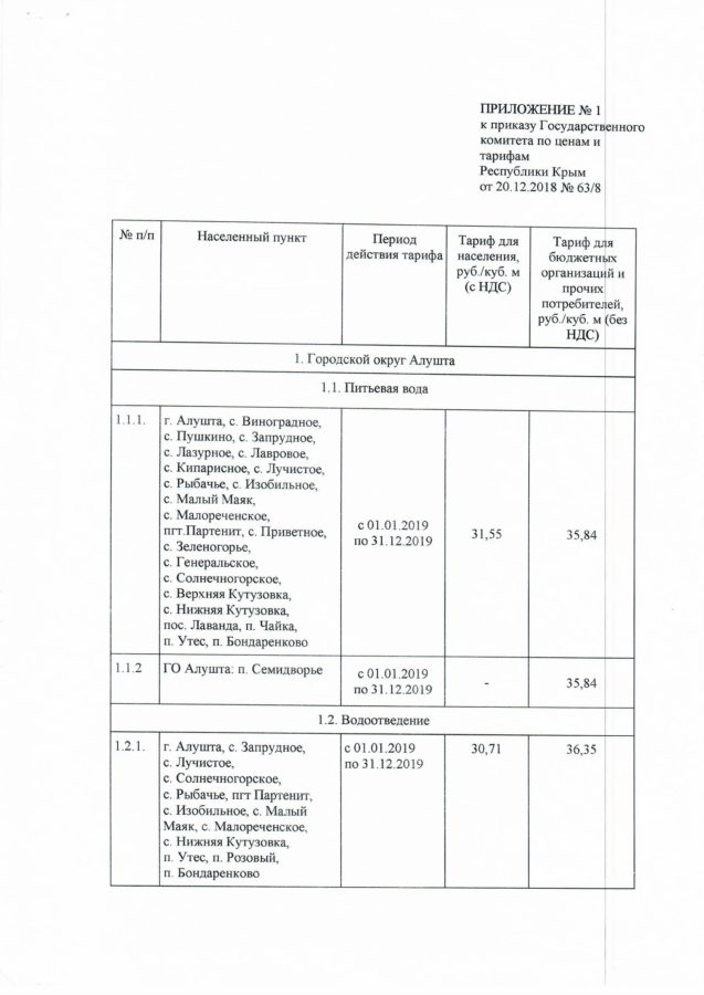 К сведению сообщаем, что в аналогичных поселках (с. Запрудное) установлены тарифы на питьевую воду и водоотведение на 2019 год для населенных пунктов на территории городского округа Алушта, относящихся к ГУП РК «Вода Крыма» в соответствии с Приказом Государственного Комитета по ценам и тарифам Республики Крым от 20 декабря 2018 года № 63/8 в следующих размерах: